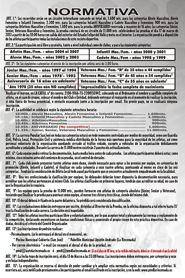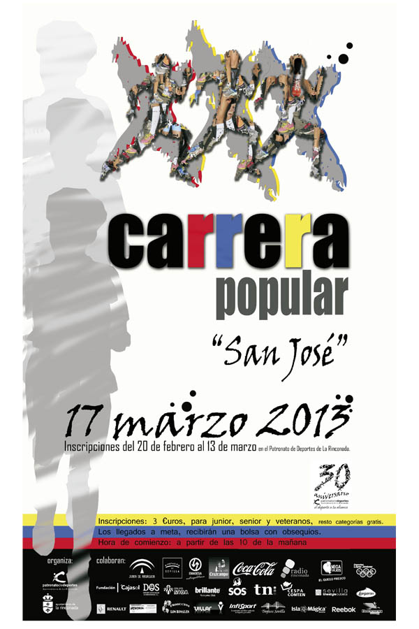 El Patronato de Deportes de La Rinconada convoca a corredores y deportistas en general, a participar el próximo domingo día 17 de marzo en la XXXª Carrera Popular San José, cuyo principal objetivo es contar con la participación del mayor número de personas, para conmemorar el treinta aniversario de nuestra prueba.